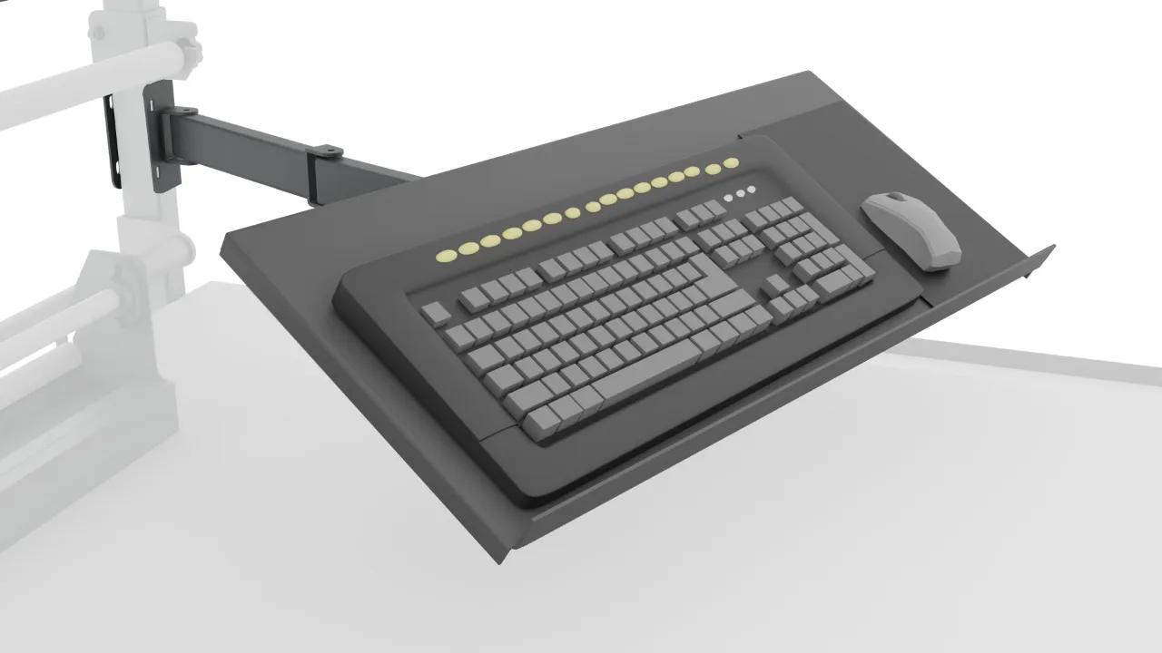 Półka o wymiarach 494×244 mm z rantem zabezpieczającym pozwala wygodnie korzystać z klawiatury i myszki, jednocześnie chroniąc je przed zsunięciem się podczas pracy. Trzy przeguby uchwytu umożliwiają płynne ustawienie w optymalnej pozycji, a montaż na dwóch śrubach zapewnia stabilność i szybki montaż.