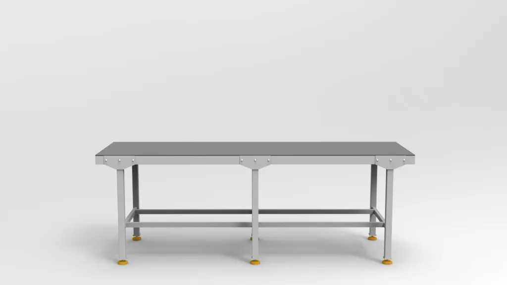 Blat o wymiarach 2500×750 mm opiera się na żebrowanej konstrukcji, wypełnionej płytą MDF 18 mm i pokrytej blachą stalową zimnowalcowaną 4 mm, która doskonale znosi uderzenia i intensywną eksploatację.