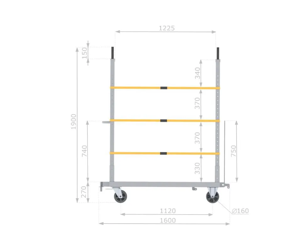 Wózek porusza się na kołach o średnicy 160 mm, z czego dwa są skrętne z hamulcem nożnym. Dla wygody operatora dodano uchwyt do prowadzenia oraz uchwyt na oznakowanie 320×220 mm. Całość została ocynkowana galwanicznie, co zwiększa odporność na korozję i nadaje profesjonalny wygląd.